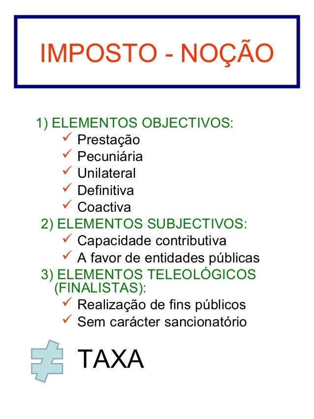 A palavra imposto tem origem no termo latim imposĭtus. Tributos, impostos , taxas. Neste post, iremos abordar os principais tributos e diferenciá-los entre si. Classificação dos impostos. A existência do elemento causal.